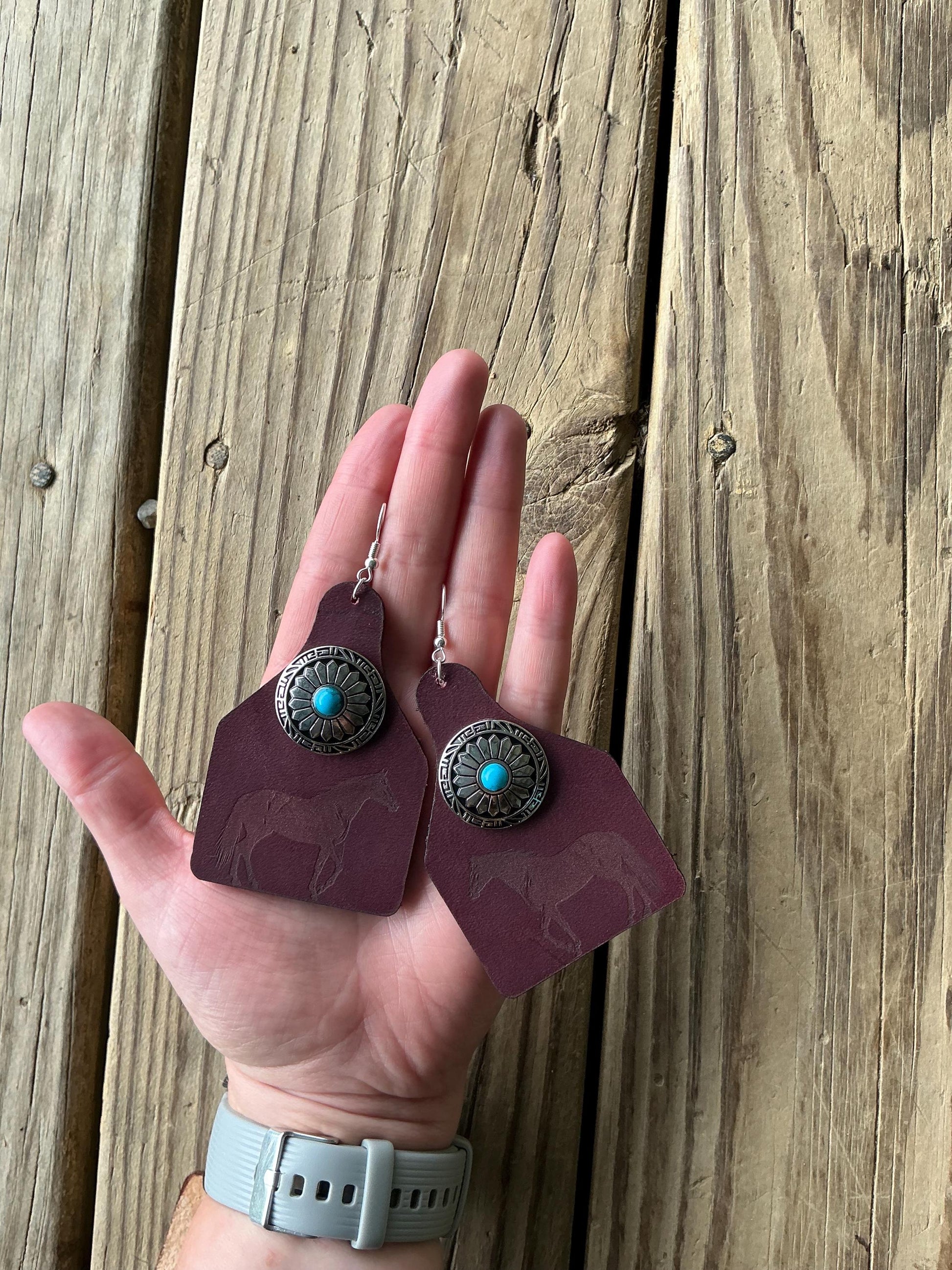 Genuine Leather Horse & Concho Cattle Tag Earrings
