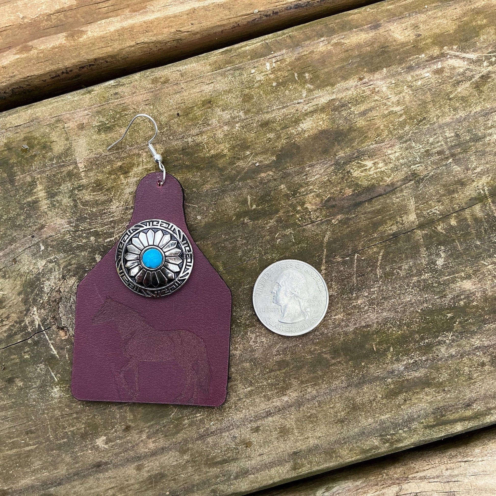 Embrace your inner cowgirl with these stunning and unique handmade earrings! Each earring features a genuine leather pendant shaped like a classic cattle ear tag, with a laser engraved silhouette of a horse. Capping off this Western design is a striking silver toned concho with a faux turquoise center.